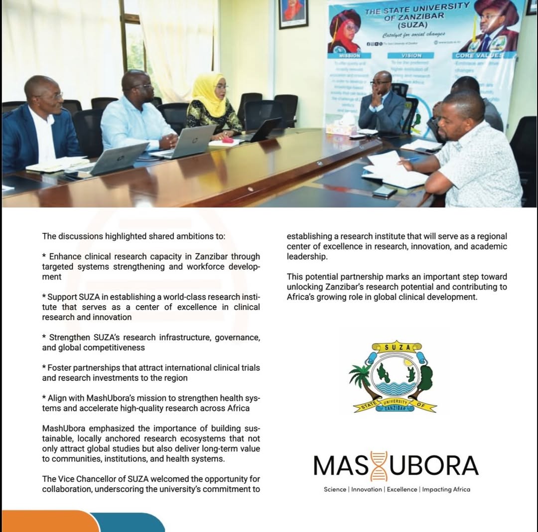 Kaimu Makamu Mkuu Chuo Kikuu cha Taifa Zanzibar SUZA Prof Abdi Talib Abdlalla amefanya mazungumzo na ujumbe wa taasisi ya MashUbora ili kushirikiana katika kuimarisha utafiti wa kimatibabu kwa kanda ya Afrika Mashariki. Akizungumza na ujumbe huo ulioongozwa na Ndg. Sehlomola Mashatole ambaye ni Mwanzilishi na Mkurugenzi Mkuu wa taasisi hiyo na Dkt. Salma AbdiRead More