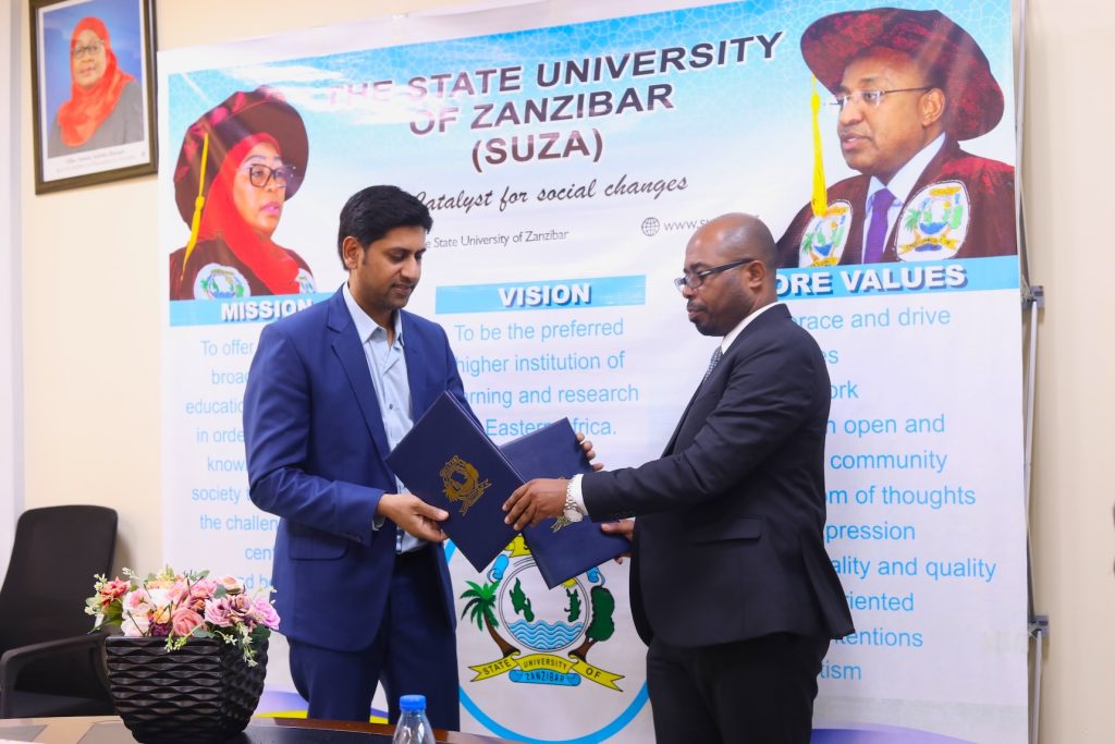 Chuo Kikuu cha Taifa cha Zanzibar (SUZA) kimesaini hati ya makubaliano ya ushirikiano wa kitaaluma na Chuo Kikuu cha Guru Kashi kutoka nchini India, ikiwa ni hatua muhimu katika kuimarisha ubora wa elimu ya juu na kupanua fursa za kitaaluma kimataifa.